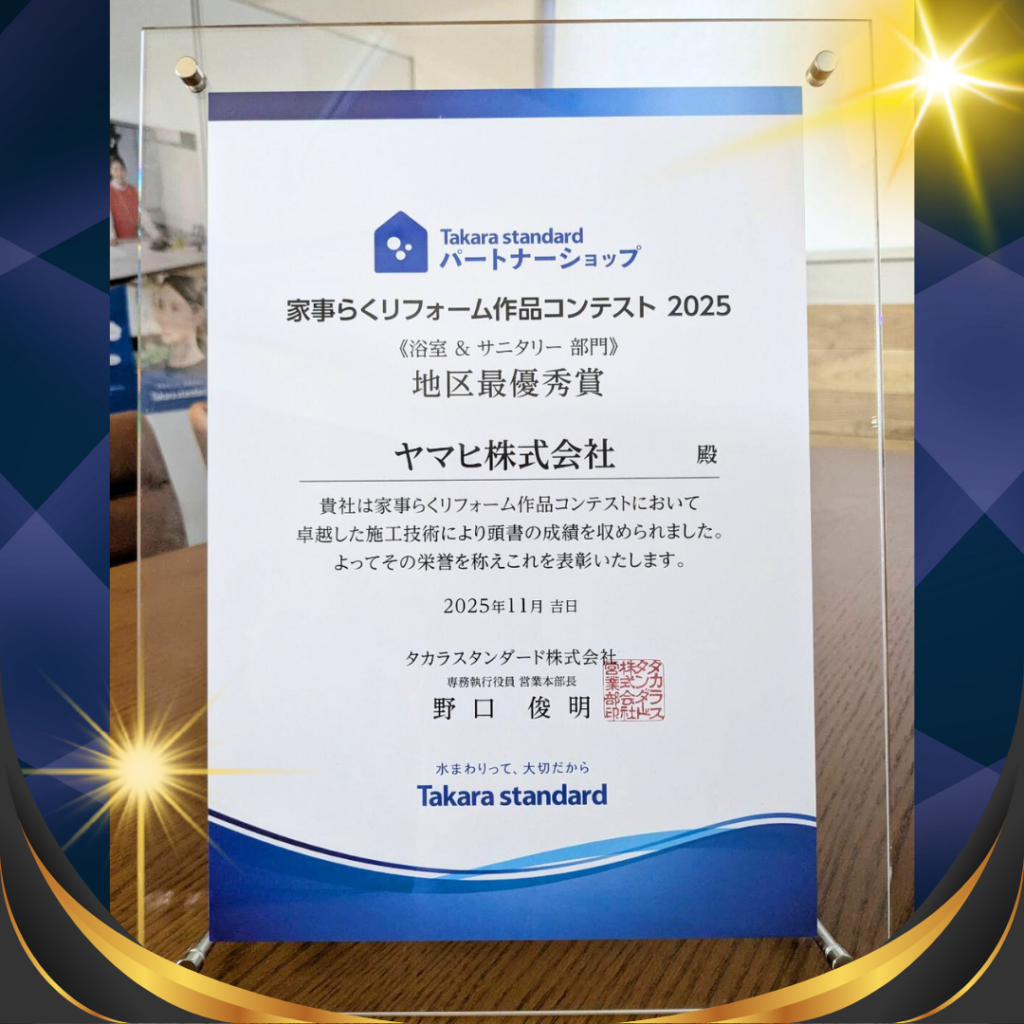このたび、弊社が施工させていただいた浴室リフォームの事例が、タカラスタンダード主催の「家事らくリフォーム作品コンテスト2025」において、兵庫県内での浴室&サニタリー部門「地区最優秀賞」を受賞いたしました👏👏