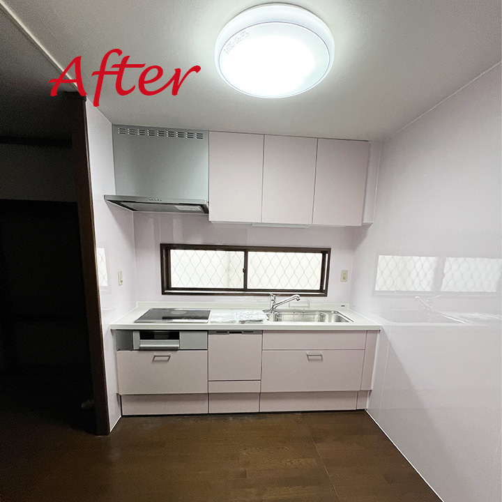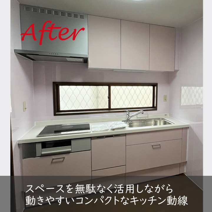 キッチンとパネルを淡いピンク色に統一し、見た目も明るく快適なキッチン空間を整えました。
