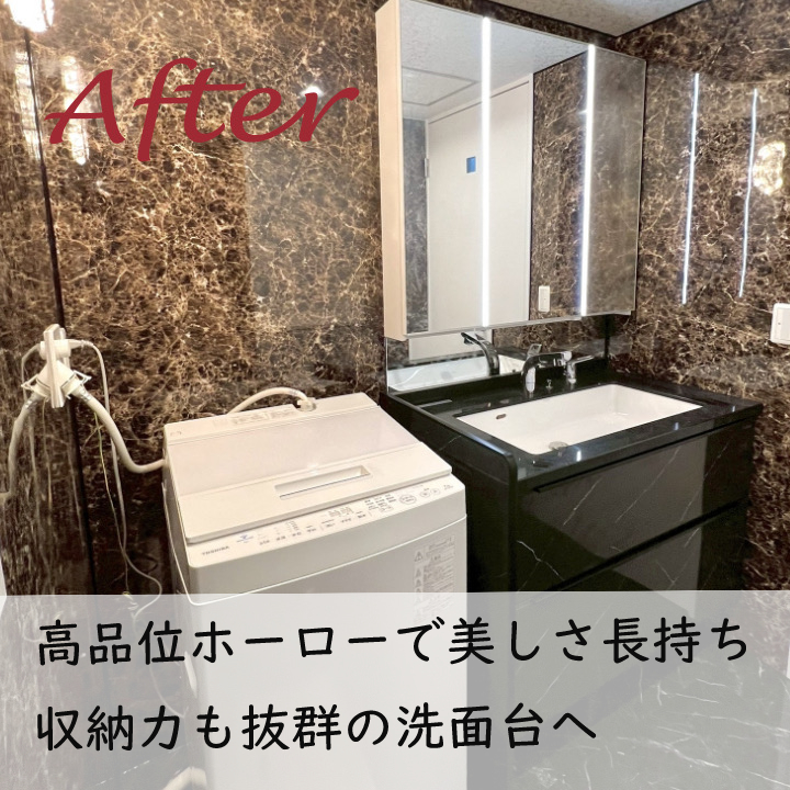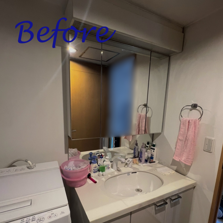 ◆旧洗面台を撤去し、タカラスタンダードのハイグレード洗面化粧台『エリーナ(三面鏡付き)』を採用しました。