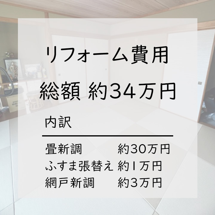 | 金額内訳 | 畳新調 約30万+ふすま張替え 約1万+網戸新調 約3万 |