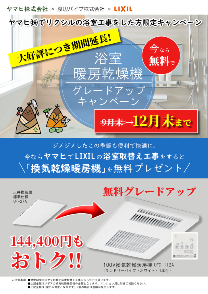 6月から開催していた『浴室暖房乾燥機グレードアップキャンペーン』が、たくさんのお客様にご好評いただき、 12月末まで延長決定いたしました✨✨