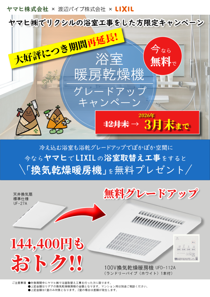 2025年6月から開催しました『浴室暖房乾燥機グレードアップキャンペーン』が、たくさんのお客様にご好評いただき、 2026年3月末まで再延長が決定いたしました✨✨